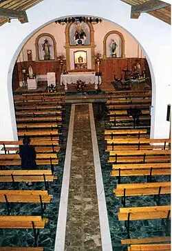 Tras la fachada se encuentra el cuerpo correspondiente a la antigua ermita. Está cubierto por un tejado a dos aguas. Su interior sigue el modelo de las iglesias medievales, con una sola nave con cubierta de madera a dos aguas, apoyada en arcos diafragmáticos y con el coro a los pies.[3]