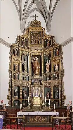 En el interior, de planta basilical, destaca la capilla mayor, cubierta con bóveda de crucería con profusión de nervios y claves y presidida por un retablo plateresco del siglo xvi obra de Cornielles de Holanda, autor del retablo mayor de la Catedral de Orense. De policromía verde oscura con motivos en dorado, cuenta con cinco cuerpos, cinco calles y un ático, en el cual destacan un Cristo crucificado con Dios Padre al fondo y, en el techo, el Espíritu Santo en forma de paloma. El retablo, presidido por una escultura de gran tamaño del Sagrado Corazón de Jesús, alberga numerosas tallas, entre ellas imágenes de Santa Rita de Casia, Santa Teresa de Lisieux, San Benito de Nursia, San Blas de Sebaste, San Roque y la Virgen del Perpetuo Socorro. A ambos lados se hallan dos retablos colaterales de estilo barroco e idéntica policromía, aunque a diferencia del retablo mayor, estos cuentan con una única hornacina enmarcada por columnas salomónicas ornamentadas con motivos vegetales, estando el de la izquierda presidido por una imagen de la Inmaculada Concepción y el de la derecha por una talla de San José.