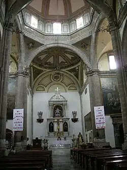 El interior es rectangular con tres naves. Seis columnas neoclásicas esculpidas sostienen la nave principal con arcos que soportan otras partes del edificio.[2][3] El techo está formado por bóvedas de cañón con lunetas en las tres áreas principales de la nave central. La cúpula tiene planta octogonal. Por encima del presbiterio hay otra bóveda y un techo formado por ocho bóvedas de cañón pequeñas. El suelo está cubierto por mosaicos rojos y blancos en la nave principal y verdes y blancos en el presbiterio. Ocho ventanas están alineadas en las paredes laterales y otras ocho en la cúpula, lo que permite la entrada de luz natural.[3]