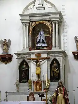 El área del coro es grande, extendiéndose sobre la parte posterior de las tres naves y está sostenida por tres arcos. El área está rodeada por una barandilla de hierro forjado con pequeñas campanas. El área de tabernáculo es de madera y contiene una imagen de la Virgen de la Soledad, cuyo ropaje es una túnica negra con bordados en hilos de plata.[2][3]