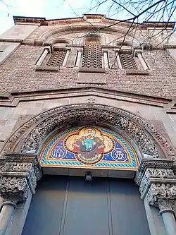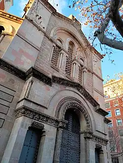 La iglesia está resuelta según líneas formales propias del bizantinismo si bien en la imagen exterior existe cierta ambigüedad, ya que se incorporan otros elementos medievalistas. En la fachada que da a la Avenida Diagonal se sitúa el acceso principal con un gran portal central y dos más pequeños en los laterales. El portal central se presenta coronado con arquivoltas de medio punto y enmarcado por dos columnas con un fuste muy adornado. También presentan decoración esculpida los capiteles y la cornisa situada a su altura. Todo este tramo está avanzado del resto de la fachada restante cubierto por un entablamento a doble vertiente. En la parte superior hay una trífora cubierta por un arco de medio punto donde cada una de las ventanas resultantes se encuentra enmarcada por dos columnas. Estos ventanales presentan una tracería de pequeños círculos tangentes con una cruz interior. En cambio, en la fachada situada en la calle Lauria, a la altura del transepto, existe una única apertura de acceso lateral, con una ornamentación y estructura compositiva muy similar. Destaca el mosaico policromo con dorados situado en el tímpano que representa a la Virgen del Carmen.[1]