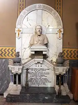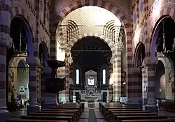 En el interno de la iglesia una inscripción conmemorativa en una gran losa de mármol recuerda los principales donantes al coste del edificio, entre ellos Benito Mussolini. El retablo del altar mayor, que representa la Asunción de María, obra del pintor romano Carlo Maratta (1625–1713), es un dono del rey Víctor Manuel III de Italia.[2][11]