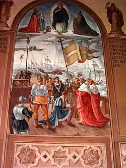 - la bendición del legado papal a Juan de Austria en una escena de la batalla de Lepanto, cuyo resultado fue adjudicado por el cristianismo a la intercesión de María, auxilio de los cristianos (auxilium christianorum).