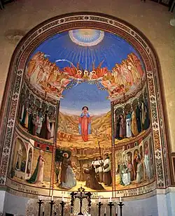 Esta planta superior es de una sola nave y tiene carácter festivo. La planta alta está dedicada a la glorificación de María, madre de Jesús en la historia del cristianismo. En el ábside se representa a la madre de Jesús rodeada de santos en el cielo y de los fieles en la tierra.