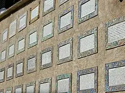 En la pared opuesta a la fachada del santuario se observa una larga serie de traducciones del Magnificat, aplicadas como placas. En 1954, había traducciones a un total de 42 idiomas. Hoy el número de placas supera las 50.[5]