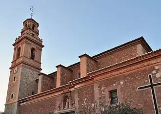 El edificio actual se eleva en los restos del que fuera antiguo templo del pueblo, que se construyó en 1528, pero su perímetro es mayor, abarcando también parte de la superficie en donde se levantaban la llamada Plaza Vella, el pozo público (que databa de 1532, y para dejar constancia de la existencia de los restos del mismo se colocó una inscripción, en latín, en uno de los muros laterales del templo, la cual reza: ” H I C A L T V S P V T E V S S V P E T R A C L A V D I T V R I S T A”, “Bajo esta piedra se cierra un alto pozo”), el horno de la villa, la antigua Casa Consistorial, e incluso la cárcel.[3][4][5] El antiguo pozo público, que era de piedra tallada, se salvó colocando dos fuertes arcos de ladrillo, sobre los cuales descansa el muro, quedando la mitad externa del pozo en la calle, mientras que la otra mitad es la base izquierda del arco que soporta el corazón.[4]