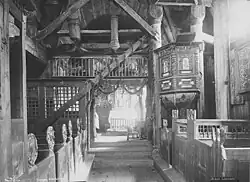 La iglesia está formada por una nave rectangular y un coro más estrecho, ambos con el espacio central elevado. En el siglo XVII se amplió el coro hacia el este, pero posteriormente se eliminó esta modificación. El dibujo de Johan Christian Dahl representa esto, así como el estado de deterioro de la iglesia en aquella época. En el siglo XX, la iglesia fue restaurada, y los tablones decorados de las paredes se cubrieron para detener su deterioro.