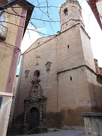 La iglesia, que pertenecía al convento del Carmen de Alcañiz se construyó en el siglo XVII, datación reforzada por la presencia en la hornacina que remata el arco de acceso de la portada de la fachada principal, con la inscripción de la fecha de 1695.[2]