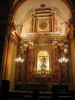 Posee una amplia nave central con capillas laterales con arcos de medio punto y alto coro a los pies, sobre el atrio interior. Sobrepasado el crucero se observa el grandioso nuevo retablo, que responde al estilo Neoclásico, aunque ricamente ornado de oro y oropeles: Las obras de construcción del retablo comenzaron el 18 de abril de 2005 y finalizaron el 30 de junio del mismo año. Contaron con un presupuesto de 50.140, 97 €, más manutención y estancia de los técnicos. El proceso decorativo supuso el empleo de diversas técnicas: dorado mixta, dorado «al mordiente», dorado «al agua», previa preparación de la superficie. Para el dorado se utilizó oro fino italiano de 22 quilates (6.250 hojas, de 8x3 cm). La policromía consistió «en la alternancia de distintos mármoles bien fingidos, alabastro, «rojo alicante» y «verde antico» elaborados a partir de veladuras y vetas.[15]