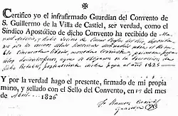 «Certifico yo el infrafirmado Guardián del Convento de S. Guillermo de la Villa de Castiel, ser verdad, como el Síndico Apostólico de dicho Convento ha recibido de Manuel Antón y Rubio vecino de Casas Bajas del Río, depositario por los vecinos de las limosnas destinadas para el Retablo Cincuenta libras, moneda corriente, primera paga de los doscientos pesos a que se obligaron en la trasacción de dicho Retablo, perteneciente dicha paga al año 1825.».[1]Del paisaje, alma del Rincón de Ademuz, Alfredo Sánchez Garzón