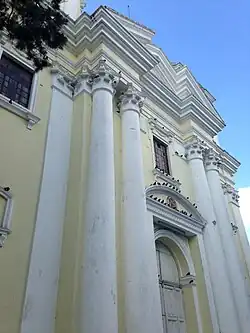 Su fachada está compuesta por dos cuerpos, tres calles y un remate central, además de unos sobrios campanarios. Las columnas son de orden compuesto, con fuste liso sobre un basamento. Estas sostienen un entablamento compuesto por un arquitrabe de tres franjas, un friso liso y una cornisa ondulante. Este conjunto sostiene un frontón quebrado, desfasado del eje, que da movimiento y dinamismo al frontispicio.