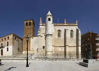 Vista de la torre de la iglesia; a la izquierda se observa las Casas del Tratado de Tordesillas.