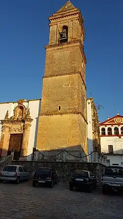 La portada de los pies está edificada en el primer tercio del siglo XVI, bajo los postulados del gótico final. Está construida en piedra sobre alto pódium que la antecede. Se estructura en dos cuerpos con gran sentido ascensional, que queda subrayado por los dos machones piramidales que la flanquean, compuestos por numerosos baquetones góticos que apean sobre pedestales y finalizan en pináculos finamente tallados y decorados con motivos de cardinas. Estos machones están adosados a otros semicirculares con remates piramidales, ubicados en ambos laterales de la portada. El primer cuerpo se conforma mediante dos amplios vanos apuntados superpuestos, ligeramente abocinados y coronados por gablete superior, ornamentado con cardinas y florón de remate. En el centro del primer arco ojival se abre un vano adintelado que da acceso al templo, recercado, al igual que el arco, por una banda decorativa tallada con motivos de guirnalda de tallos y flores carnosas. Sobre la puerta de entrada en el tímpano del arco se inserta un relieve con la clásica representación iconográfica de San Jorge a caballo, alanceando un dragón alado y a la derecha una figura femenina. En su pedestal aparece la inscripción «RO DO ALCALA». El relieve se encuentra tallado con minuciosidad y detallismo en una sola pieza de piedra. El conjunto está rodeado de molduras a modo de alquería apuntada, polilobulada y entrelazada. Tanto el trasdós del segundo arco de la portada, como los capiteles de las pilastras adosadas a las jambas de la puerta de entrada y las impostas del arco, muestran relieves tallados en piedra donde se representa un repertorio de animales fantásticos y personajes imaginarios, todos diferentes y característicos de la mitología gótica, tales como reptiles, leones, grifos y saltimbanquis en escorzos y actitudes forzadas, a fin de adaptarse al espacio de los elementos arquitectónicos donde se insertan. El resto del paramento de este primer cuerpo, correspondiente a las enjutas del arco, se decora con finas columnillas talladas en relieve, que sostienen una red de arcos ciegos, apuntados y entrelazados, que se ordenan en cuatro tramos, habiendo sido aprovechados con posterioridad los dos tramos extremos para apertura de dos vanos, con objeto de intensificar la iluminación interior del templo. El segundo cuerpo es de menor altura, en ambos extremos aparece una decoración a base de relieves, compuestos de dos columnillas que sostienen un copete de arquillos ciegos de formas apuntadas, entrelazados y rematados con un florón superior. En el centro de este cuerpo se abre un vano rectangular abocinado y cubierto con cristales de diferentes colores, que al igual que el frontón recto que corona la fachada son obras posteriores. La torre se levanta en el ángulo izquierdo de la fachada de los pies. Se edifica entre 1629 y 1637 en estilo barroco. Tiene planta cuadrangular, con alzado de cuatro cuerpos construidos en ladrillo visto. Los tres primeros están separados por una cornisa y en sus frentes se abren vanos irregulares. En el cuarto cuerpo o campanario se abre un vano de medio punto en cada lado cubierto con antepecho de hierro de perfil semicircular. Estos vanos albergan campanas y se hallan flanqueados por dobles pilastras adosadas de orden toscano. Tras el entablamento y doble cornisa se alza el chapitel piramidal que cubre la torre, el cual está revestido de azulejería azul y blanca. Asimismo, en cada uno de sus frentes se inserta una cruz latina, compuesta de otros azulejos de diferente diseño y colorido. El conjunto se corona con veleta y cruz de hierro forjado.
