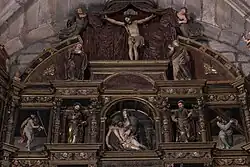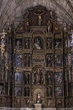 La iconografía del retablo es compleja y diversa. El banco principal está ocupado por los Evangelistas, difusores de la palabra de Dios, acompañados de cuatro Santas Mártires. Los plintos que rodean estas figuras están decorados con seis bustos humanos masculinos y femeninos. El primer cuerpo se divide en dos niveles separados por un lintel de carácter vegetal. El segundo cuerpo se construye con un relieve centrado en la Virgen de la Asunción y flanqueada por los apóstoles San Pedro y Santo Tomás. El tercer cuerpo está presidido por el grupo escultórico de la Quinta Angustia y flanqueado por dos apóstoles. Finalmente el ático, compuesto en medio punto, está compuesto por las figuras de Cristo crucificado, la Virgen María y San Juan sujetados por dos ángeles. El conjunto del retablo está completado por la representación de la Anunciación en sus extremos.[7]