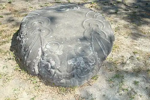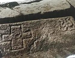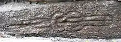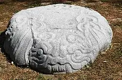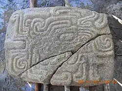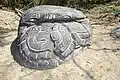 Altar "Monstruo de la Tierra del Norte", Cabeza labrada en relieve de un posible saurio con motivos celestes y terrestres.