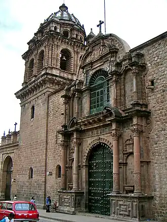 La iglesia de la Compañía de Jesús fue construida en 1576 y tuvo que ser derruida en 1650 debido a los daños que sufrió en el terremoto de ese año.[6]. En 1651 se inició la construcción del actual edificio que se extendió por 17 años hasta 1668. La iglesia es de piedra, destacándose el basalto rosado y la andesita. Su fachada es un ejemplo clásico del barroco andino[7] y cuenta en su interior con varias pinturas de la escuela cuzqueña. Constituye un complejo religioso al incluir dos capillas laterales, la Capilla de Nuestra Señora de Loreto y la capilla de San Ignacio que actualmente aloja a la Sociedad de Artesanos del Cusco[8]