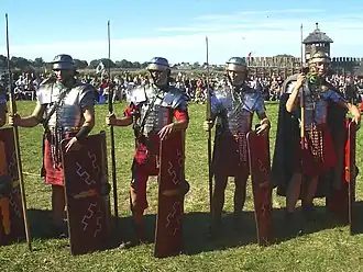 Una típica legión romana (cuyo emblema era un águila plateada) consistía en diez cohortes (con su respectivo estandarte) cada una de ellas con cinco o seis centurias de ochenta hombres subdivididas en diez contubernios (unidad básica de ocho legionarios que compartían tienda), contando pues cada legión cinco o seis mil hombres de infantería, divididos en cincuenta o sesenta centurias. Contaba también con las guerrillas regulares auxiliares y de caballería (alae) con ciento veinte hombres de caballería.