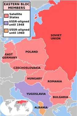 Estos países fueron los aliados más cercanos de la Unión Soviética. Eran miembros del Comecon, una comunidad económica dirigida por los soviéticos y fundada en 1949. Además, los que están ubicados en Europa Oriental también eran miembros del Pacto de Varsovia. A veces se los llamaba el bloque soviético y eran ampliamente vistos como estados satélites soviéticos.