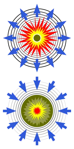 Uno de los tipos de armas nucleares que existen es de implosión; en este caso es la compresión de una masa fisionable subcrítica esférica o cilíndrica. La implosión funciona detonando los explosivos en la superficie externa del objeto, por lo que la onda expansiva se mueve hacia adentro. La onda se transmite al núcleo fisionable, comprimiendo y aumentando su densidad hasta alcanzar el estado crítico (véase masa crítica).