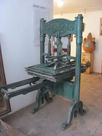 La primera prensa de hierro fundido se le atribuye a Earl Stanhope, hacia 1800. El sistema de columnas, que se utiliza para bajar la platina, fue patentado por Abraham Stansbury en 1821.[11]