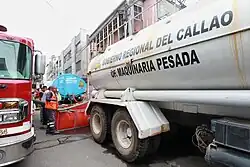 ![]() Cisternas controlando el incendio en el lugar de los hechos junto a la unidad de bomberos. | ||