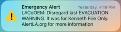 - ↑ «Alerta de evacuación de emergencia fue enviada por error a un gran número de residentes de Los Ángeles». Los Angeles Times en Español. 10 de enero de 2025. Consultado el 10 de enero de 2025.