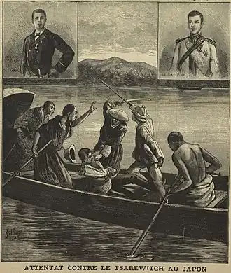 El ataque al príncipe Nicolás ocurrió el 29 de abril de 1891 (en el calendario juliano; el 11 de mayo del calendario gregoriano moderno), cuando el zarévich regresaba a Kioto después de un viaje de un día al Lago Biwa, en Otsu, Prefectura de Shiga. Fue atacado por Tsuda Sanzo (1855-1891), uno de los policías de su escolta, que cruzó la cara del zarévich con un sable samurái denominado katana. La acción rápida del primo de Nicolás, el príncipe Jorge de Grecia y Dinamarca, que paró en seco el segundo golpe con su bastón, le salvó la vida. Tsuda luego intentó huir pero dos conductores de rickshaw en el entorno de Nicolás lo persiguieron y lo redujeron en el suelo. Nicolás quedó con una herida de nueve centímetros de largo en el lado derecho de la frente; no fue mortal, pero le quedó una cicatriz de por vida.