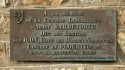 Detalle de la plaza en la fachada del ayuntamiento de Plourivo conmemorando la batalla entre Alano II de Bretaña y los vikingos en río Trieux (en la placa figura curiosamente Icon, no Incon). | ||