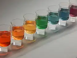 Un indicador universal suele ser una disolución acuosa o hidroalcohólica que contiene 1-propanol, fenolftaleína, hidróxido de sodio, rojo de metilo, azul de bromotimol, bisulfito de sodio y azul de timol.[5] Con esta mezcla se consiguen una gama de colores que van desde el rojo intenso hasta el azul violeta, pasando por varias tonalidades de verde en la zona próxima a pH neutro. Los colores que indican el pH de una solución, después de añadir un indicador universal, son: