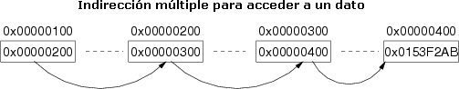 En el siguiente ejemplo, la "celda" (dirección de memoria 0x00000100) contiene el dato 0x00000200 que a su vez representa la dirección de la nueva "celda" que contiene el dato que corresponde a una dirección que contiene un dato que representa la dirección 0x00000400 que finalmente contiene el dato que nos interesa. Y así podemos definir a voluntad o conveniencia los diferentes niveles de indirección que necesitemos.
