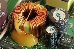 En un inductor enrollado en un núcleo en forma de varilla recta, las líneas de campo magnético que salen de un extremo del núcleo deben pasar por el aire para volver a entrar en el núcleo en el otro extremo. Esto reduce el campo, ya que gran parte del recorrido del campo magnético está en el aire en lugar del material del núcleo de mayor permeabilidad y es una fuente de interferencia electromagnética. Se puede conseguir un mayor campo magnético e inductancia formando el núcleo en un circuito magnético cerrado. Las líneas de campo magnético forman bucles cerrados dentro del núcleo sin salir del material del núcleo. La forma que se suele utilizar es la de un toroideal o núcleo de ferrita con forma de rosquilla. Debido a su simetría, los núcleos toroidales permiten que una parte mínima del flujo magnético escape fuera del núcleo (lo que se denomina flujo de fuga), por lo que irradian menos interferencias electromagnéticas que otras formas. Las bobinas de núcleo toroidal se fabrican con diversos materiales, principalmente ferrita, hierro en polvo y núcleos laminados.[13]