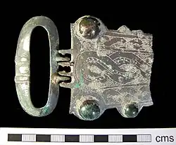 Los hallazgos arqueológicos indican que el cinturón siguió utilizándose en el traje masculino anglosajón desde el siglo VII hasta el IX. Los cuchillos se suspendían a menudo de los cinturones y, a principios del siglo VII, empezaron a aparecer gavillas de cuero con cuchillos. Las bolsas de cuero y tela hacen su aparición inicial durante este período de tiempo. Muchas de las hebillas eran simples y pequeñas, aunque se han descubierto hebillas más elaboradas y opulentas. Los entierros de Kent incluyen varias hebillas triangulares grandes de cinturón en tumbas masculinas. La conversión de la Inglaterra anglosajona al cristianismo se demuestra en la aparición de hebillas con los símbolos de la cruz y el emblema del pez. Como se ve en la escultura de Santa María Bishophill en York de dos hombres anglosajones, los cuernos podían estar suspendidos del cinturón.[56][57]