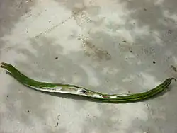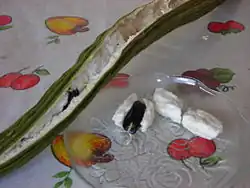 El fruto es una vaina aplanada, indehiscente, de color verde, multisurcado longitudinalmente y de largo variable, pudiendo llegar hasta el metro de longitud. Las semillas son verdes, de 3 cm de longitud, con un rango entre 1,4 y 5 cm, cubiertas por una pula (arilo) blanca, suave y azucarada.