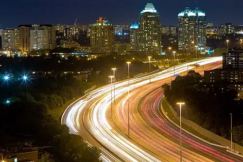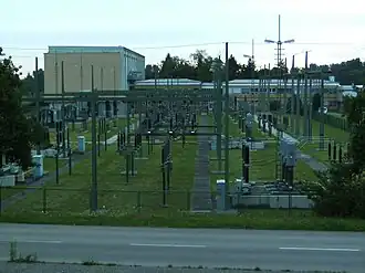La distribución de energía eléctrica es la etapa final en la entrega de energía eléctrica ; lleva electricidad desde el sistema de transmisión a los consumidores individuales. Las subestaciones de distribución se conectan al sistema de transmisión y bajan la tensión de transmisión a media tensión entre2 kV y35 kV con el uso de transformadores. Las líneas de distribución primarias llevan esta energía de media tensión a los transformadores de distribución ubicados cerca de las instalaciones del cliente. Los transformadores de distribución vuelven a bajar la tensión a la tensión de utilización utilizada por la iluminación, los equipos industriales y los electrodomésticos. A menudo, varios clientes se abastecen desde un transformador a través de líneas de distribución secundarias. Los clientes comerciales y residenciales están conectados a las líneas de distribución secundarias a través de caídas de servicio. Los clientes que exigen una cantidad de energía mucho mayor pueden conectarse directamente al nivel de distribución principal o al subtransmisor nivel. Trazado general de redes eléctricas. Los voltajes y cargas son típicos de una red europea. La transición de transmisión a distribución ocurre en una subestación de energía, que tiene las siguientes funciones: