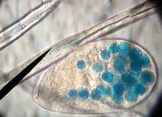 - Las larvas del parásito Trichinella se enquistan dentro de los músculos y son transmitidos cuando un nuevo hospedero (u hospedador o anfitrión) come la carne infectada de un anfitrión anterior.[18]