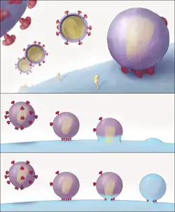 Un virión de VIH uniéndose a la célula humana CD4+. Las dos imágenes de abajo representan dos modelos propuestos de la fusión del VIH con la célula.