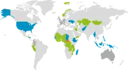 Burkina Faso.- Mauritania.- Camerún.- Mongolia.- República Centroafricana.- Nigeria Costa de Marfil.- República Democrática del Congo.- Noruega.- Guinea Ecuatorial.- Perú.- Gabón.- República del Congo.- Ghana.- Santo Tomé y Príncipe.- Guinea.- Sierra Leona.- Kazajistán.- Tanzania.- Kirguistán.- Timor Oriental.- Liberia.- Yemen.- Madagascar.- Zambia.- Malí.- Guatemala.- Trinidad y Tobago.- República Dominicana.-