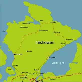 Inishowen (en irlandés: Inis Eoghain) es una península del condado de Donegal y la segunda de Irlanda, sólo precedida por la península de Iveragh en el condado de Kerry, al suroeste del país. Antedata la formación del condado del cual forma parte en varios siglos.