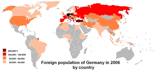 La inmigración en Alemania es muy variada y está dominada por la procedente de áreas culturalmente multidiversas. En Alemania, la mayoría de los inmigrantes provienen de Europa Oriental y Medio Oriente (el 36,21% del total de extranjeros afincados en Alemania, según el censo INE 2006); les siguen después los procedentes de la Asia Oriental (34,45%) y del norte de África (14,83%). A gran distancia se encuentran los extranjeros provenientes de la Europa comunitaria (4,40%), el África subsahariana (4,12%), América Latina (2,72%), el Subcontinente indio (1,67%), América del Norte (0,66%) y Filipinas (0,48%). Del resto de Asia y de Oceanía sólo son originarios el 0,50% restante, mientras que están registrados un 0,02% de apátridas.