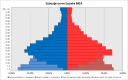 España es, además, el décimo país del planeta que más inmigrantes tiene en números absolutos, por detrás de países como Estados Unidos, Rusia, Alemania, Ucrania, Francia, Canadá o el Reino Unido.[32] En los cinco años posteriores al año 2000, la población extranjera multiplicó por cuatro, asentándose en el país casi tres millones de nuevos habitantes. Según el censo de 2014, el 10,7% de los residentes en España era de nacionalidad extranjera. A causa de la crisis económica que atraviesa España, del 2010 al 2011, se produjo un descenso por primera vez en la historia de 37 056 personas en cifras absolutas.[33]