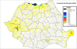 Los ucranianos (en ucraniano: Українці, en rumano: Ucraineni) son la tercera diáspora más numerosa de las minorías étnicas de Rumania. Según un censo rumano de 2011, se estimó un total de 51 703 personas, lo que representa el 0.3 % de la población total.[1] Los ucranianos afirman que el número real ronda las 250 000-300 000 personas.[2] Los ucranianos viven principalmente en el norte de Rumania, en zonas cercanas a la frontera con Ucrania. Más del 60 % de los ucranianos rumanos viven en Maramureș (31 234), donde representan 6.77 % de la población. Poblaciones considerables de ucranianos también se encuentran en los distritos de Suceava (5698 personas), Timiș (5953), Caraș-Severin (2600), Satu Mare (1397), Tulcea (1317) y Arad (1295). Los ucranianos constituyen la mayoría poblacional en siete comunas rurales (comună) de Maramureș (Bistra, Bocicoiu Mare, Poienile de sub Munte, Remeţi, Repedea, Rona de Sus y Ruscova) y tres en el distrito de Suceava (Balcauti, Izvoarele Sucevei y Ulma), así como en Ştiuca (Timiş) y Copăcele (Caras-Severin). Según el censo de 2002, el 79 % de los ucranianos afirmaron ser ortodoxos orientales —organizados en el vicariato ortodoxo ucraniano de Sighetu Marmaţiei—, pentecostales (10 %), y grecocatólicos (2.8 %) —organizados en el vicariato grecocatólico ucraniano de Rădăuţi—, adventistas del Séptimo Día (2.1 %), ortodoxos lipovanos (1.2 %) y el 2.9 % declaró que pertenecían a «otra religión».[3]