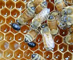 - ↑ Seeley, Thomas D.; Tarpy, David R. (7 de enero de 2007). «Queen promiscuity lowers disease within honeybee colonies». Proceedings of the Royal Society of London B: Biological Sciences (en inglés) 274 (1606): 67-72. ISSN 0962-8452. PMC 1679871. PMID 17015336. doi:10.1098/rspb.2006.3702.