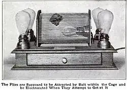 En su edición de octubre de 1911, la revista Mecánica Popular tenía un artículo mostrando un modelo de "trampa para moscas" que utilizaba todos los elementos de un moderno exterminador de insectos, incluyendo la luz eléctrica y la rejilla electrificada. El diseño fue ejecutado por dos hombres no identificados de Denver y decía ser demasiado caro para ser de uso práctico.[2]