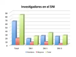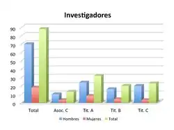 De acuerdo con el Estatuto de Personal Académico de la UNAM, son seis los niveles en los que se clasifican los investigadores de la institución de acuerdo con sus méritos académicos. En los institutos de investigación son admitidos sólo cuatro: Investigador Asociado C, Investigador Titular A, Investigador Titular B E Investigador Titular C. La tabla siguiente y la gráfica asociada dan el número de investigadores (hombres y mujeres), por niveles, de acuerdo con el Estatuto de Personal Académico de la UNAM, siendo Titular C (Tit. C) el nivel más alto.