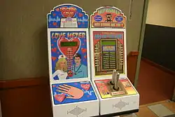 Instrumentos de medición divertidos: una máquina probadora de amor y una máquina probadora de fuerza en un área de descanso de Framingham, Massachusetts