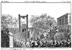 El 3 de octubre de 1793 la Convención, tras oír un informe del Comité de Seguridad General en el que se exponían los supuestos crímenes y traiciones de los veintidós líderes girondinos que se encontraban en prisión, ordenó al Tribunal Revolucionario que iniciara el juicio contra ellos (otros tantos, al estar huidos, fueron declarados hors la loi —'fuera de la ley'—). Se quiso llevar también ante el Tribunal a setenta y seis diputados de la Convención que habían firmado en junio, en secreto, un escrito de protesta contra la expulsión de los girondinos, y que por esta causa estaban en prisión. Maximilien Robespierre, quien desde el 27 de julio formaba parte del Comité de Salvación Pública —máximo órgano del "gobierno revolucionario"— se opuso y les salvó la vida.[18] El 30 de octubre los veintidós girondinos —entre ellos Brissot y Vergniaud— fueron condenados a muerte y guillotinados al día siguiente.[19]