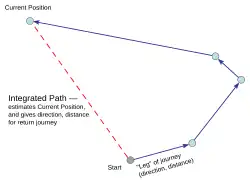 Charles Darwin inicialmente postuló en 1873 un sistema de navegación en animales basado en la inercia.[1] Los estudios empezados a mediados del siglo XX confirmaron que los animales podían regresar directamente a un punto de partida, como un nido, en ausencia de visión y habiendo emprendido un complicado viaje hacia el exterior. Esto muestra que pueden utilizar pistas o indicios para llevar un seguimiento de la distancia y dirección a fin de estimar su posición; y por ende, para cómo llegar a casa. Este proceso fue denominado integración de ruta para capturar el concepto de integración continua de pistas de movimiento a lo largo del viaje. La manipulación de pistas inerciales confirmó que al menos una de estas pistas de movimiento (o idiotéticas) es información proveniente de los órganos vestibulares, los cuales detectan movimientos en las tres dimensiones. Otras pistas son probablemente la propriocepción (información procedente de músculos y articulaciones sobre la posición de las extremidades), la eferencia motora (información procedente del sistema motor que le indica al resto del cerebro cuáles movimientos fueron ordenados y ejecutados), y el flujo óptico (información del sistema visual que indica cuán rápido se está moviendo el mundo visual a través de los ojos). Estas fuentes de información en su conjunto pueden indicar a un animal en qué dirección se está moviendo, a qué velocidad, y por cuánto tiempo. Por otra parte, la sensibilidad al campo magnético de la tierra en los animales subterráneos (p. ej., la rata de topo) puede proporcionar integración de ruta.[2]