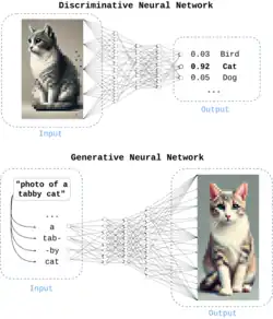 En 2014, avances como el autocodificador variacional y la red generativa adversativa produjeron las primeras redes neuronales profundas prácticas capaces de aprender modelos generativos, en lugar de discriminativos, de datos complejos como imágenes. Estos modelos generativos profundos fueron los primeros capaces de generar no solo etiquetas de clase para imágenes, sino también imágenes completas.[18]