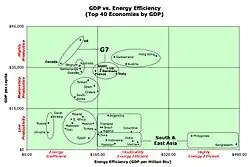 No es necesariamente una causa directa que un PIB per cápita elevado se asocie a una menor eficiencia energética económica. El gráfico anterior muestra ejemplos basados en las 40 mayores economías nacionales.