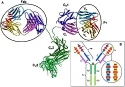 En un anticuerpo, la región Fab (fragmento, unión a antígeno) se forma a partir del extremo amino terminal de las cadenas ligeras y pesadas del polipéptido de inmunoglobulina. Esta región, llamada dominio variable (V), está compuesta por secuencias de aminoácidos que definen cada tipo de anticuerpo y su afinidad de unión a un antígeno. La secuencia combinada de cadena ligera variable (VL) y variable de cadena pesada (VH) crea tres regiones hipervariables (HV1, HV2 y HV3). En VL, estos son aproximadamente de los residuos 28 a 35, de 49 a 59, y de 92 a 103, respectivamente. HV3 es la parte más variable. Así, estas regiones son el paratopo, el sitio de unión de un antígeno. El resto de la región V entre las regiones hipervariables se denominan regiones marco. Cada dominio V tiene cuatro dominios marco, a saber, FR1, FR2, FR3 y FR4.[4][6]
